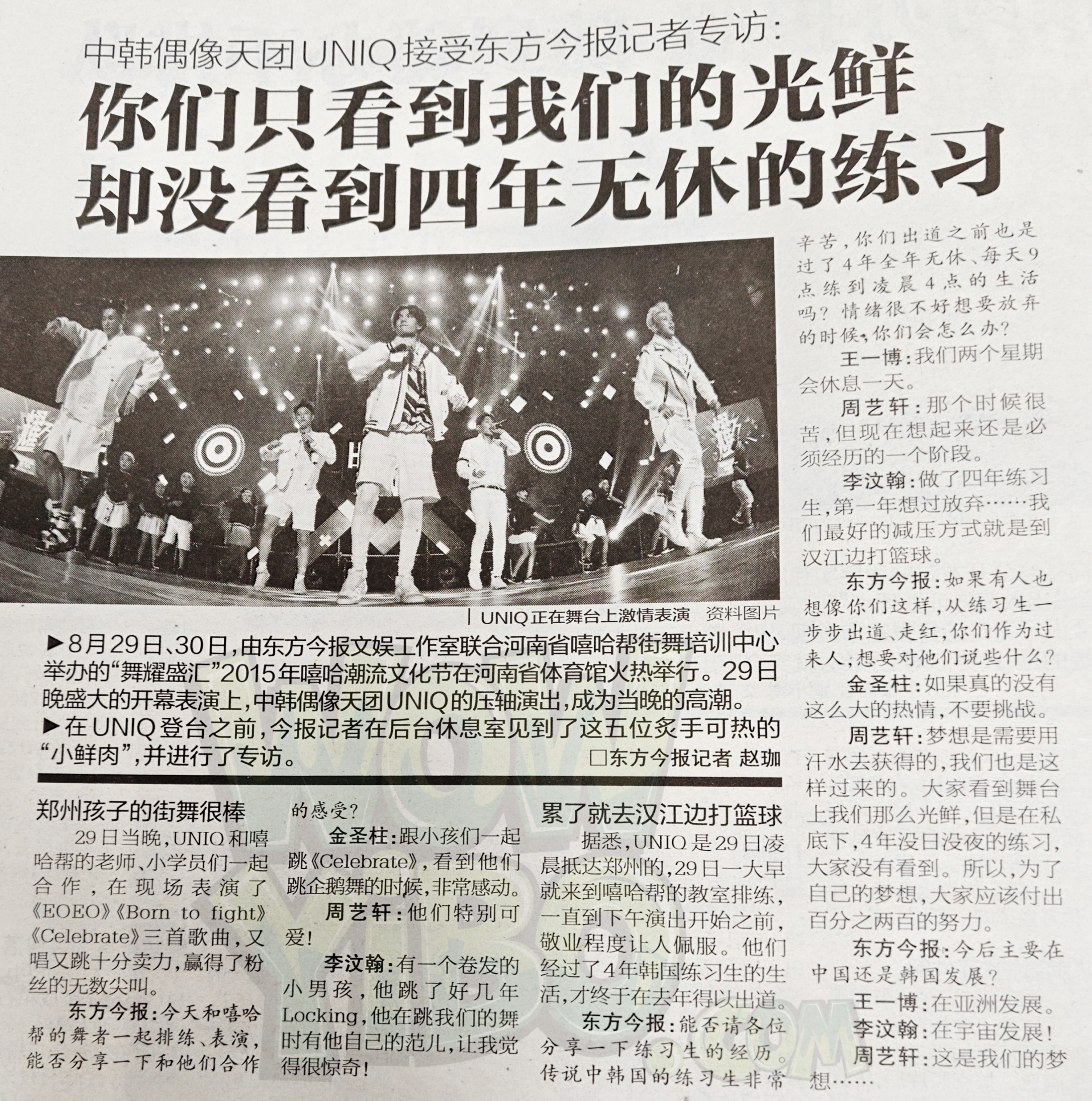 150831 《东方今报》UNIQ专访:你们只看到我们的光鲜 却没看到四年无休的练习