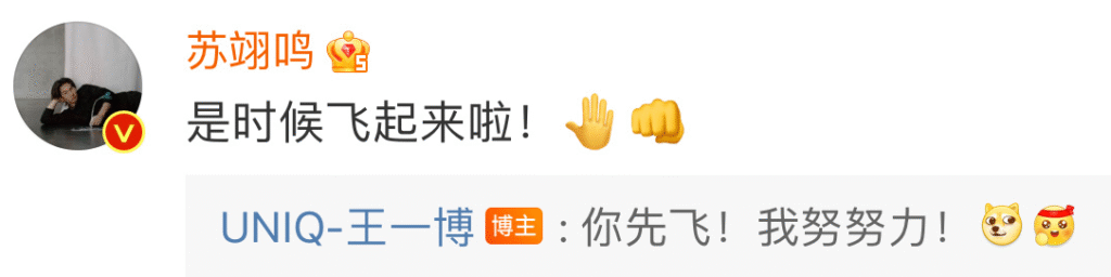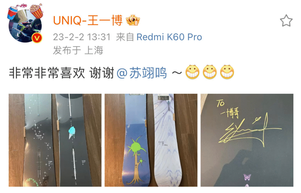 230202 @UNIQ-王一博 微博 发表于2023年2月2日由WOWYIBO项目组 非常非常喜欢 谢谢@苏翊鸣 ~ 苏翊鸣评论:是时候飞起来啦! 王一博回复苏翊鸣:你先飞!我努努力! 相关阅读251113 UGG王一博×苏翊鸣广告花絮