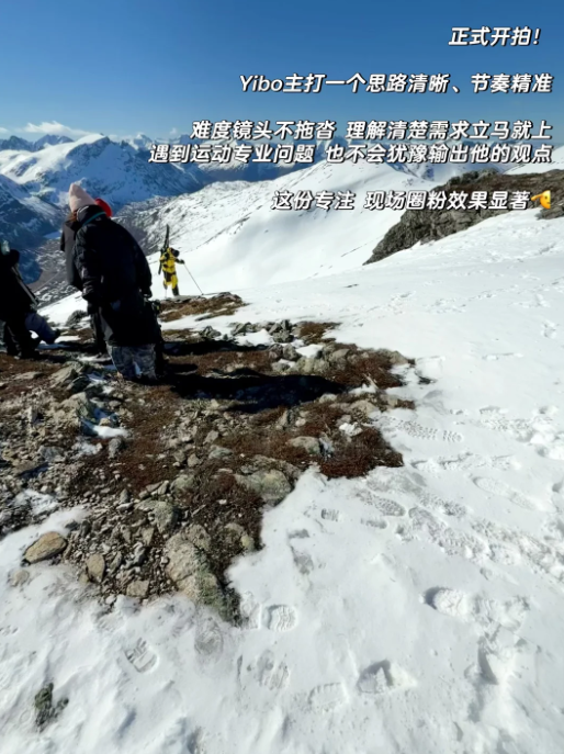 更令人印象深刻的是,在拍摄一个需要体现攀登精神的镜头时,现场最佳位置既陡峭又因湿雪而滑腻,团队一度犹豫。Yibo在了解动线后,果断而沉稳地到位,配合拍摄直到捕捉到完美画面。我们在监视器前屏息凝神,他却从容入戏
